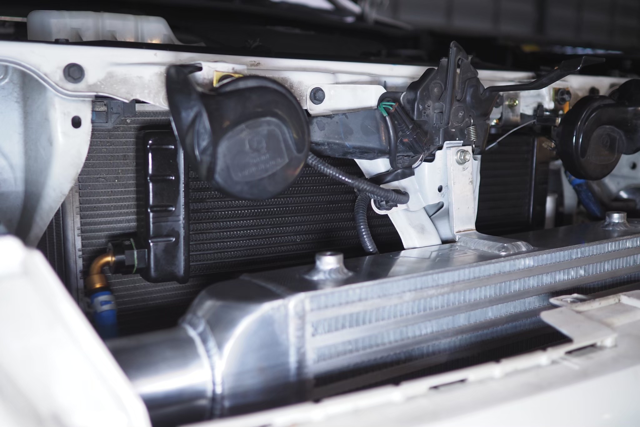 รถFortuner จำนวนไม่น้อยที่อัพเกรด inter cooler ตัวใหญ่มา พื้นที่จะเหลือน้อย ตำแหน่งการยึดแผงจึงสำคัญ จากภาพจะเห็นว่าแผงตัวนี้อยู่ในตำแหน่งที่ยังรับลมได้ดี และไม่อยู่หลัง inter เต็มๆ ถือว่าตำแหน่งลงตัวที่สุดเพราะแม้รถติดก็ยังจะได้แรงลมดูดจากพัดลมเดิมของรถช่วยพอสมควร